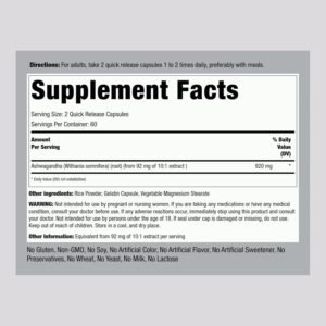 Ashwagandha Root (Withania somnifera), 920 mg (per serving), 120 Quick Release Capsules. Salud cardiovascular y bienestar general.
