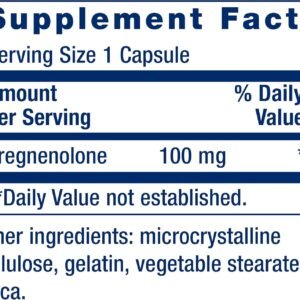 Suplemento en cápsulas con 100 mg de pregnenolona por dosis, pensado para apoyar funciones cognitivas, memoria, estado de ánimo y mantener niveles hormonales juveniles. Ideal para longevidad, mente clara y bienestar integral. Fórmula libre de gluten y no-GMO.