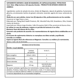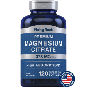Magnesio Citrato Piping Rock 375 mg por porción. Fórmula de alta absorción en cápsulas blandas de rápida liberación. Mineral esencial para la función muscular, nerviosa y la energía. Producto 100 por ciento original, importado de Estados Unidos. Frasco de 120 softgels.