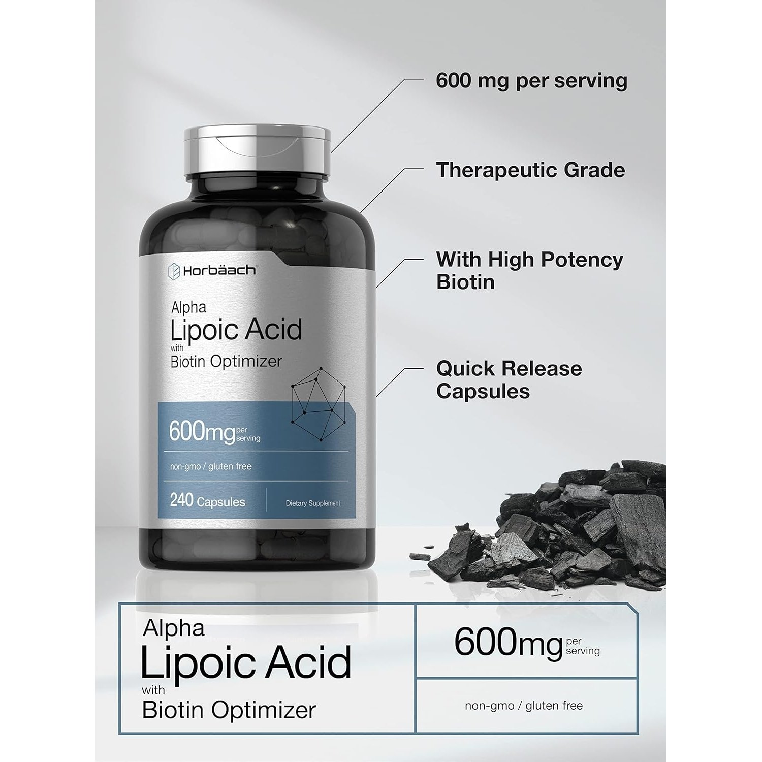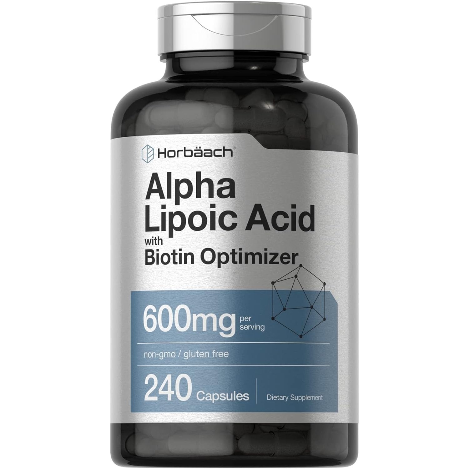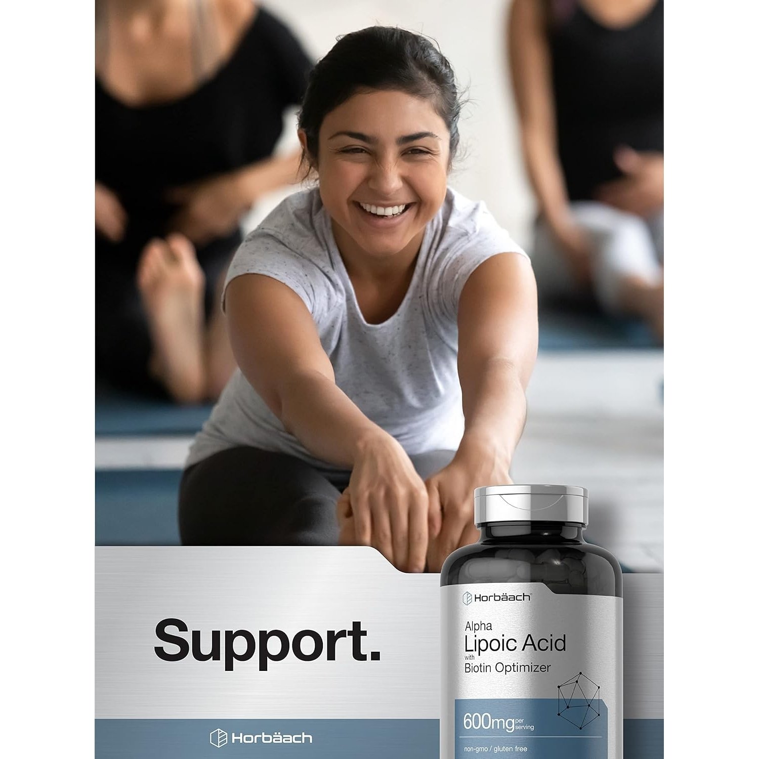 Ácido Alfa Lipoico 600 mg Horbaach con Biotin Optimizer. Potente antioxidante que apoya el metabolismo, la energía y la salud celular. Fórmula no GMO y libre de gluten. Producto 100 por ciento original importado de Estados Unidos.