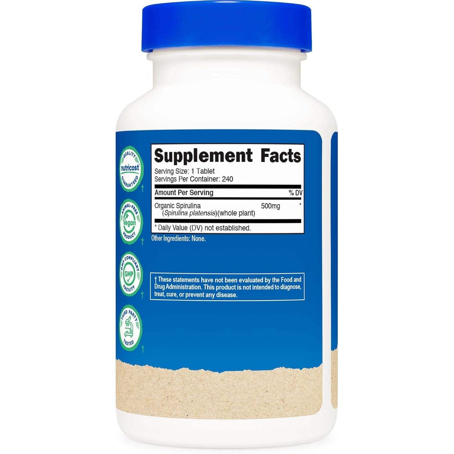 La Spirulina Orgánica de Nutricost ofrece 500 mg por tableta, certificación USDA Organic y un total de 240 unidades por frasco, ideal para complementar la nutrición diaria, aportar energía y fortalecer el sistema inmunológico de manera natural.