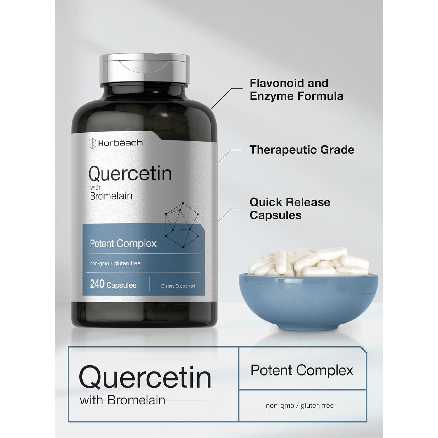 Cápsulas de liberación rápida con quercetina y bromelina de alta potencia —flavonoides y enzimas vegetales de respaldo científico—. Esta combinación refuerza la defensa antioxidante, contribuye al bienestar del sistema inmunológico y promueve una respuesta saludable al estrés celular. Presentación de 240 cápsulas para uso continuo dentro de un estilo de vida saludable. Compatible con dietas sin gluten, libre de lactosa y sin sabores artificiales ni edulcorantes añadidos.